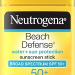 - Um bastão de 42,5 g de protetor solar facial e corporal Neutrogena Beach Defense com FPS 50+. Ideal para famílias ativas, este protetor solar de tamanho de viagem é perfeito para reaplicar facilmente durante todo o dia, garantindo proteção contínua